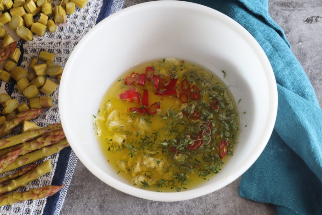 Bereid de dressing in een kom: fijngehakte knoflook met de knoflookpers, gesneden peper, tijm en een snufje zout en peper.