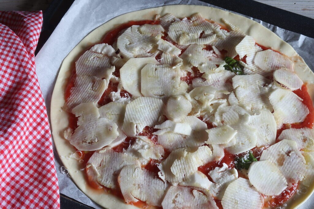 • Schil de aubergine met het schilmesje en snijd het dun, gebruik de mandoline om zeer dunne plakjes aubergine te krijgen, leg ze op het bladerdeeg en breng op smaak met zout en olie.