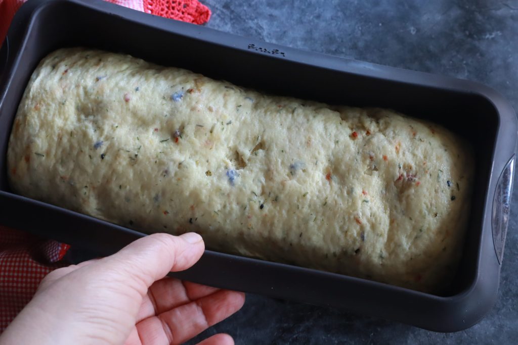 Ik zet de oven aan op 190°C en bak het brood in blik met kruiden voor 30 minuten.