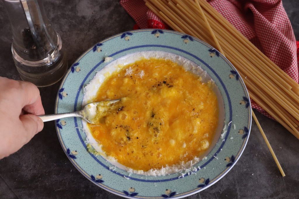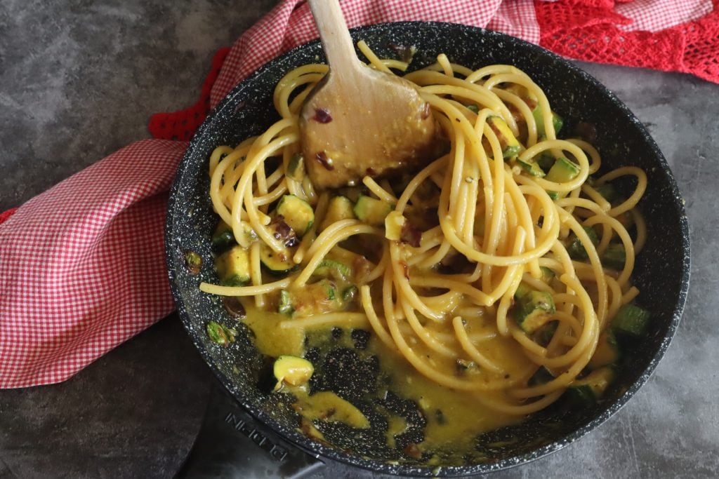 • Giet de bucatini direct in de pan met de courgettes en giet er ook de eieren met de pecorino over. Zet het vuur onder de pan uit en roer de bucatini een paar seconden als een carbonara.
