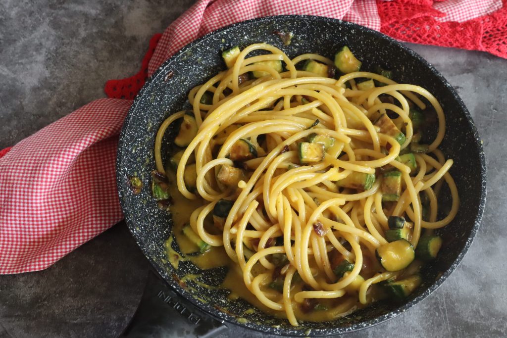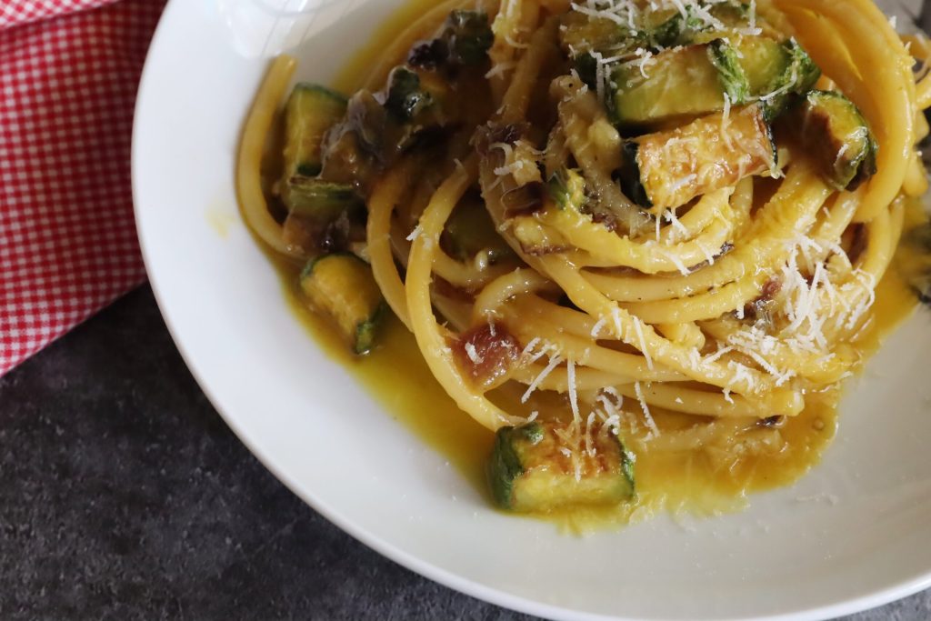 Bucatini alla carbonara met courgette. Intussen zijn het spaghetti alla carbonara en bucatini alla matriciana, maar zoals je al weet, pas ik in de keuken aan wat ik heb en wat ik lekker zou vinden om te eten. Ik meng vaak de ingrediënten en ben altijd blij met het resultaat, vooral als het om pasta gaat: een hoofdgerecht wordt nooit geweigerd. Vandaag dacht ik goed na over het verbruiken van wat er in de koelkast overblijft van de boodschappenweek en, vanaf maandag, na het weekendje weg, begint de nieuwe boodschappenronde.