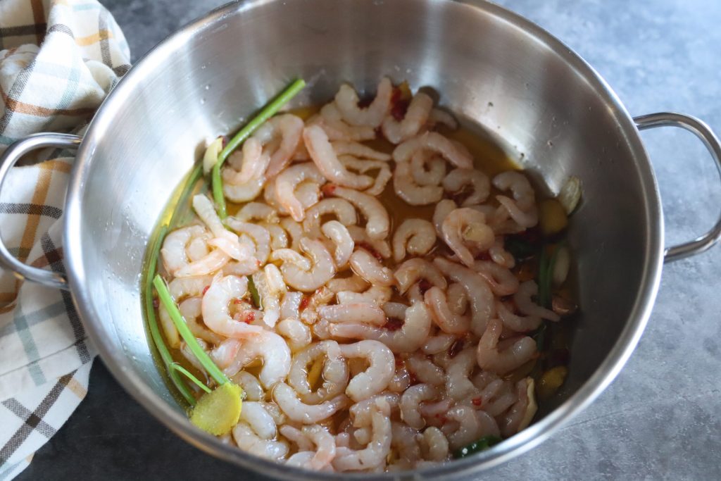 In de pan heb ik de knoflook gedaan met de steeltjes van de peterselie, de citroenschil en een stukje hete chilipeper, olijfolie en zodra het warm was heb ik de garnalen toegevoegd. Ik blus met de wijn en zodra die is verdampt voeg ik een eetlepel concentraat toe.