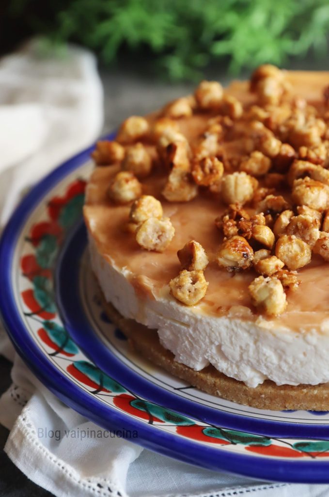 Verwijder de uitsteekvorm voordat je de cheesecake serveert, giet de gezouten karamel erover en versier met gekarameliseerde hazelnoten.