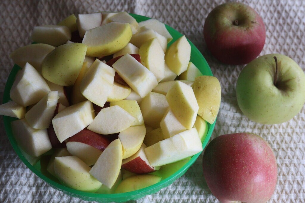 Ik snijd de appels in stukjes zonder ze te schillen, je hebt er minstens 700 gram nodig