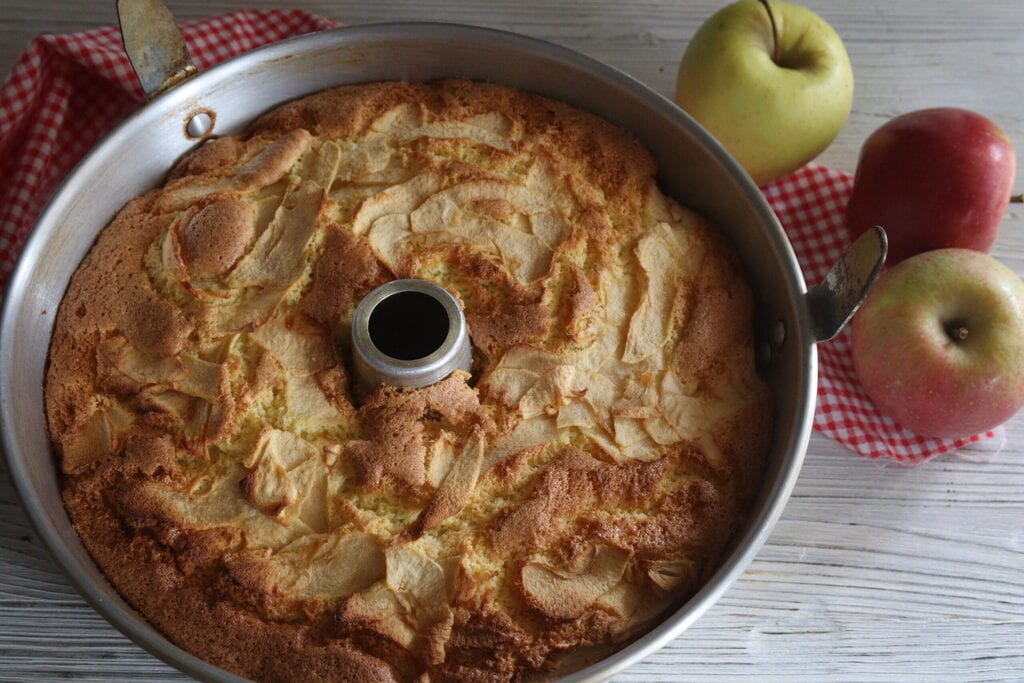 Chiffon cake met appels, of beter gezegd met appelsap, ik kon niet beslissen of ik een appeltaart of een chiffon cake wilde maken, dus besloot ik ze te combineren in één dessert. De chiffon cake is een Amerikaans dessert dat in de jaren ’20 in Los Angeles werd uitgevonden door een verzekeraar met een passie voor bakken, en hij werkte een tijd aan dit bijzondere dessert totdat hij het eindresultaat bereikte dat we allemaal kennen met eventuele aanpassingen. De naam ‘chiffon’ duidt aan hoe zijdezacht deze cake is.
