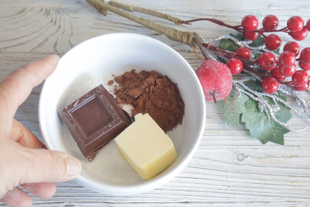 de boter met de chocolade en de cacao met de suiker samen in de magnetron gedurende 60 seconden op de hoogste stand.