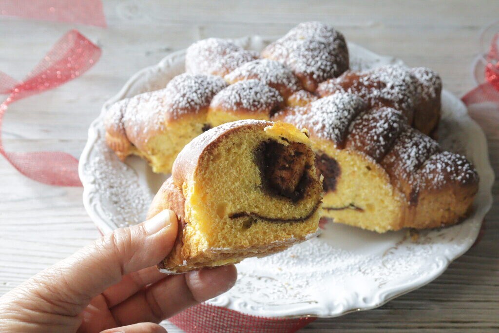 Ik rol elk stuk briochedeeg uit met een deegroller en smeer er een lepel chocoladevulling op, maak een snede van het midden naar de rand