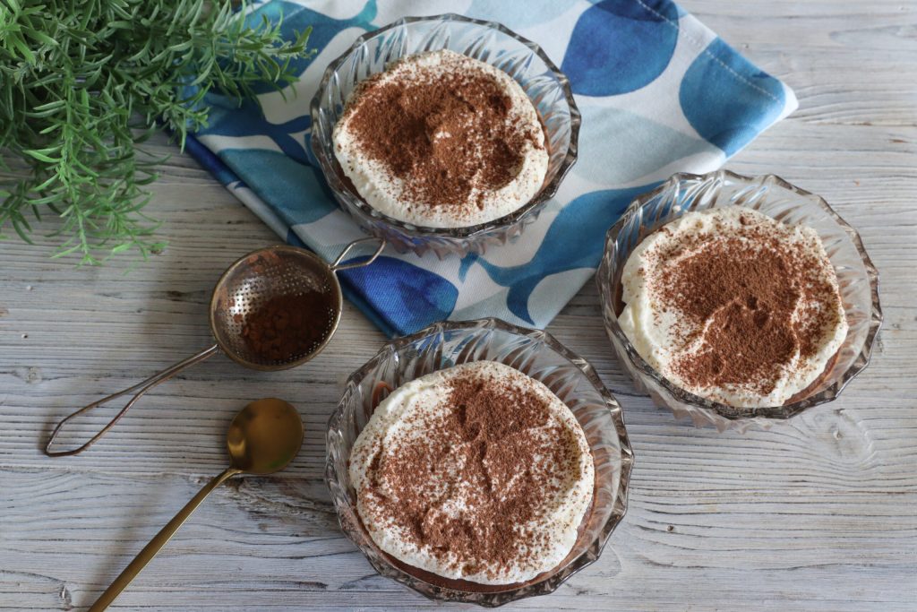Bestrooi met ongezoet cacao en serveer de chocolademousse met room.