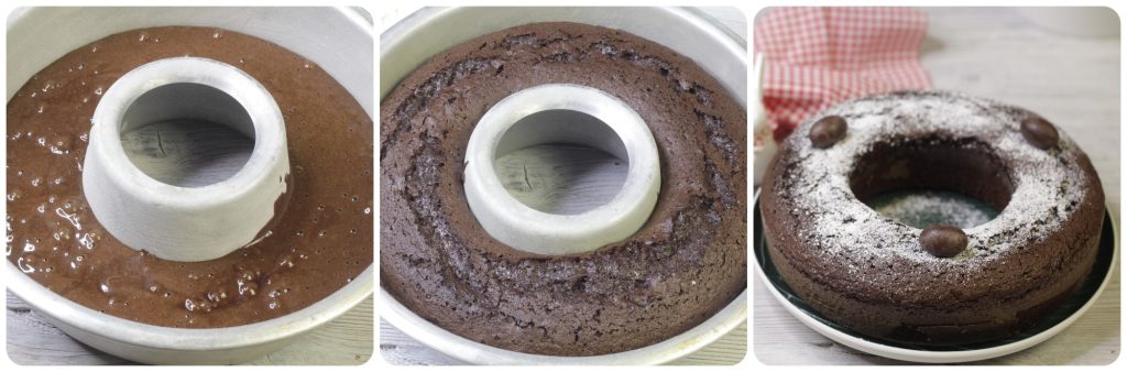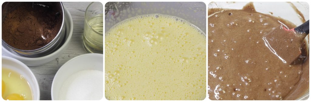 Eieren en suiker moet je opkloppen totdat ze schuimig zijn; voeg daarna in een dunne straal de plantaardige olie toe terwijl je blijft kloppen. Meng vervolgens het cacaopoeder, de bloem en het bakpoeder en zeef ze.