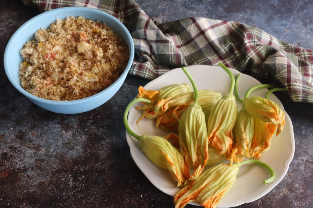 Om de gevulde courgettebloemen te bereiden, heb ik het gekruide broodkruim gebruikt dat ik had gebruikt om de Siciliaanse aubergines, die hele kleine, te vullen. In de notities hieronder heb ik het recept met de link toegevoegd als je het wilt bekijken.