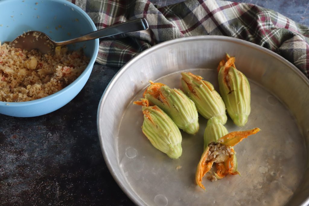 Vul de courgettebloemen met het gekruide broodkruim. Bestrijk de gevulde courgettebloemen met een kwastje met extra vergine olijfolie en rol ze door het paneermeel.