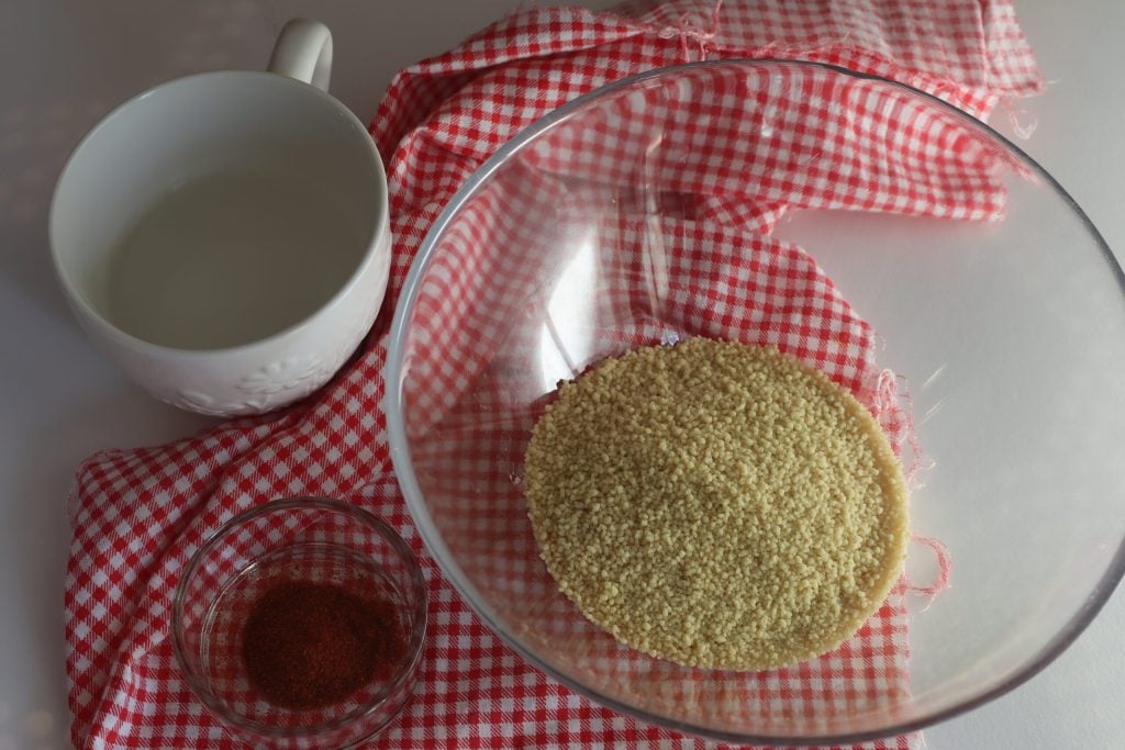 Voor 100 g couscous is een gelijke hoeveelheid water nodig.