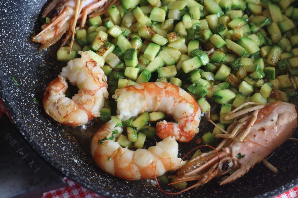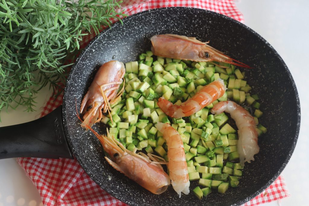 Verwijder het pantser en de darm van de garnalen, verwijder ook de kop en kook alles samen met de courgettes; 10 minuten is voldoende.