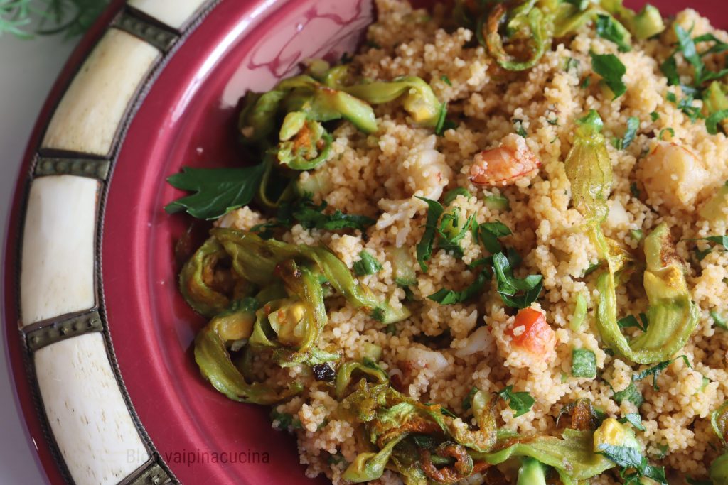 Couscous garnalen en courgettes, voedzaam, eenvoudig en licht gerecht, ideaal voor warme periodes zoals de zomer, wanneer we weinig zin hebben om in de keuken te staan en dus van tevoren kunnen bereiden. Een goed alternatief voor koude pasta of rijstsalade, couscous leent zich graag voor een koud gerecht met groenten of vis, maar ook beide. Couscous wordt gemaakt van durumtarwe die met water wordt bewerkt tot korrels en het is zeker een zeer moeilijke handeling die alleen door ervaren handen kan worden uitgevoerd. Gelukkig zijn ze tegenwoordig al voorgekookt op de markt verkrijgbaar, enkel om te rehydrateren en naar wens op smaak te brengen voor koude of warme gerechten. De oorsprong van couscous dateert uit de 8e eeuw na Christus onder de Berberse bevolkingen in Algerije, Marokko en Tunesië en in de 11e eeuw in het hele Middellandse Zeegebied, inclusief Sicilië.