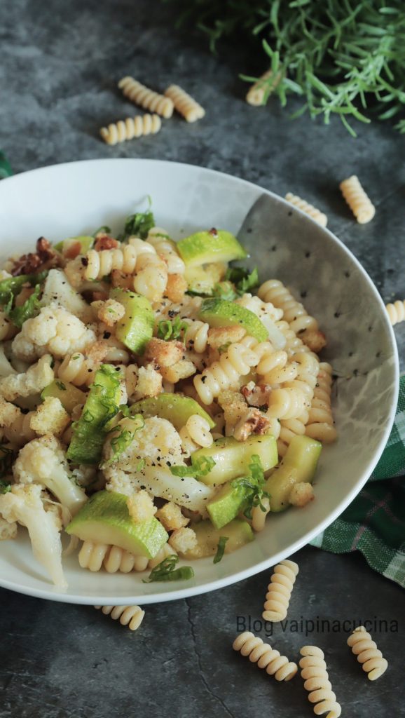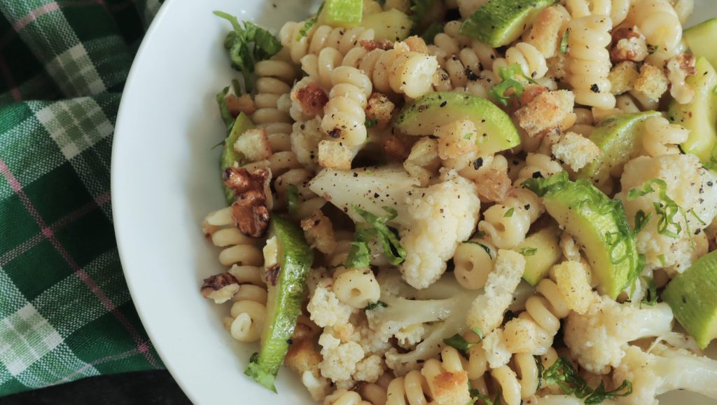 De fusilli zijn klaar en al dente, meng ze in de pan met de bloemkool en courgettes, een klein beetje kookwater en de walnoten.
