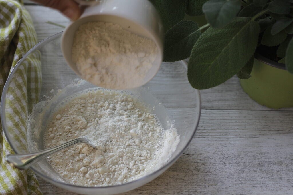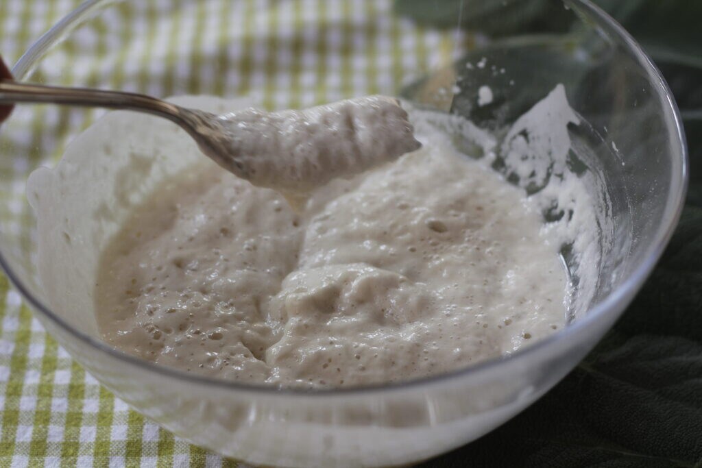 Begin met het oplossen van de gist en de suiker in water. Voeg al kloppend de bloem toe en als laatste het zout.