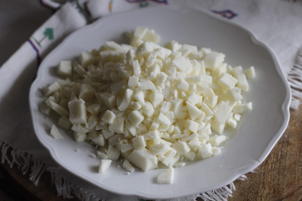 Op dezelfde manier snijd je de kaas in dunne blokjes
