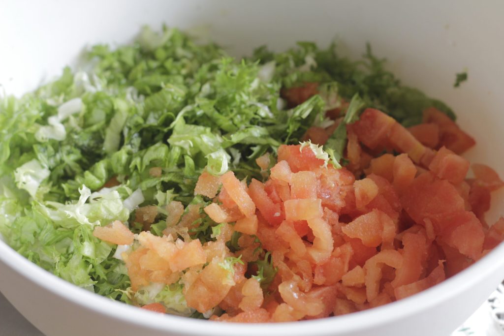 Ondertussen dat het deeg 30 minuten rust, heb je tijd om de krulandijvie en de tomaten te wassen en heel dun te snijden.