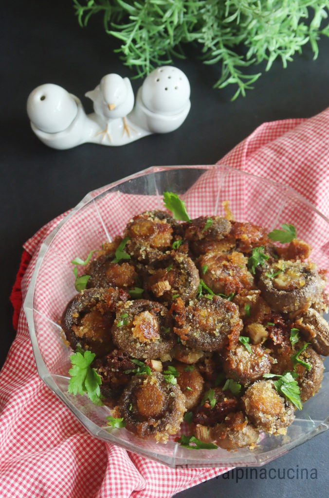 • Ik snijd het steeltje van de paddenstoelen en leg ze op de bakplaat met bakpapier, inclusief de steeltjes, breng op smaak met zout en extra vergine olijfolie, paneermeel en peterselie.