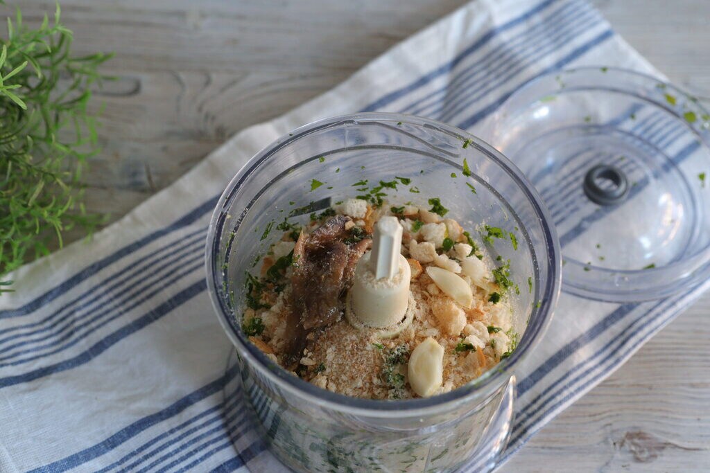 Doe het paneermeel met de knoflook, peterselie, ansjovisfilets, geraspte citroenschil, zout en olie in de hakmolen. Voeg desgewenst ook de paprika en gemalen zwarte peper toe.