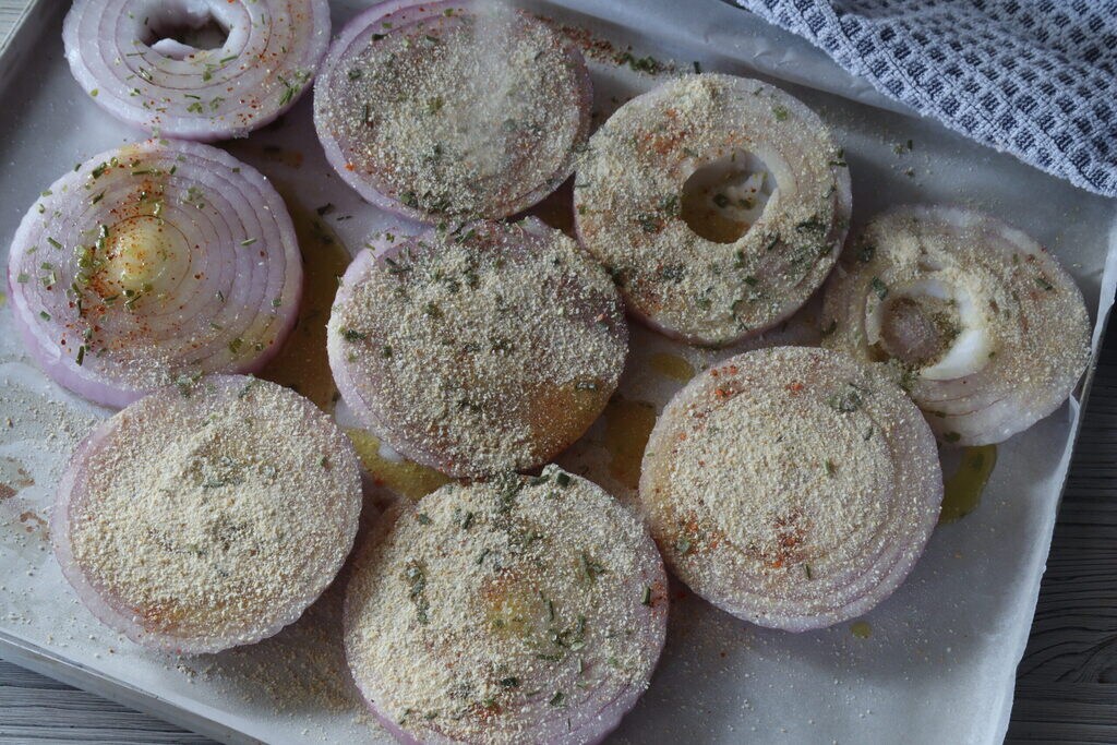 Op het bakpapier van de bakplaat heb ik de uienplakken geplaatst
