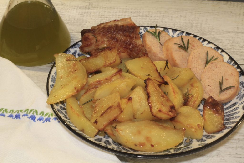 • Ik heb de aardappelen schoongemaakt en in stukken en plakken gesneden, ik heb ze gekruid met zout en olijfolie, met rozemarijn en knoflook. Ik heb alles in de ovenschaal gedaan met bakpapier samen met de rollade van kip, ik heb het besprenkeld met een glas witte wijn. Met de oven al voorverwarmd heb ik het gehaktbrood van kip met de aardappelen 35 minuten op 200° gebakken.