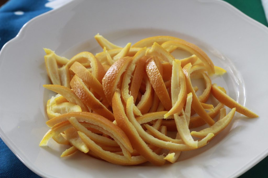 • Hier zijn de gekonfijte sinaasappelschilletjes klaar!
