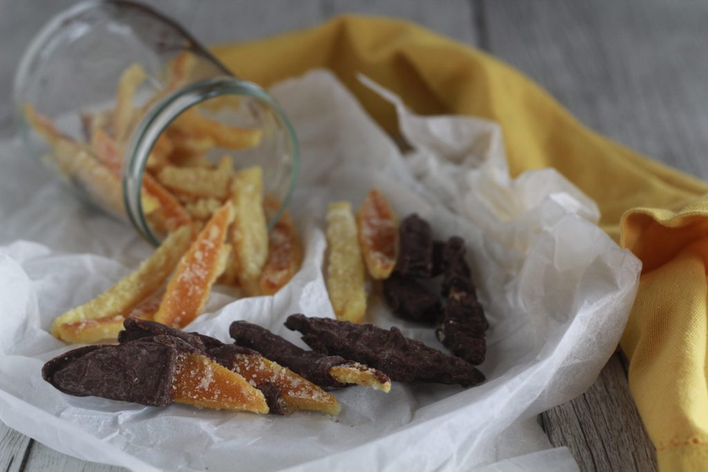 Gekonfijte sinaasappelschilletjes, dit is de juiste periode. Natuurlijk moet je biologische sinaasappels hebben, omdat we precies de schillen van de sinaasappels gaan gebruiken. Dit recept is ook geschikt voor citroenen, cedri en andere citrusvruchten. Gekonfijte sinaasappelschilletjes zijn heel gemakkelijk te maken en nog makkelijker te gebruiken in recepten zoals rijstmeel muffins glutenvrij. Maar zeker weten dat jullie zelf wel weten hoe je ze gebruikt. Leuk ook als cadeau voor vrienden in de kerstperiode, of gedoopt in gesmolten chocolade, of het nu puur of wit is. Zodra ze gedroogd zijn kun je ze tot zes maanden bewaren in een luchtdichte pot — als dat lukt, bij mij houden ze het van Kerst tot Tweede Kerstdag, een klassieker. Deze manier om sinaasappelschillen te konfijten is altijd deel van hoe ik in de keuken werk, niets gaat verloren.