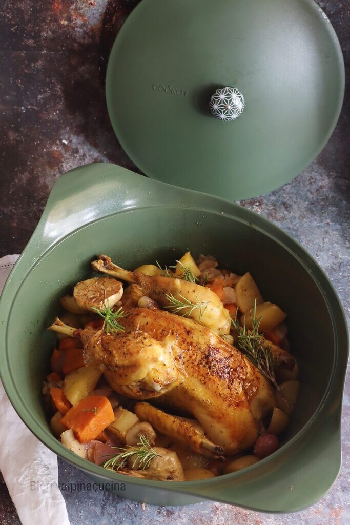 Geroosterde haan met Ongelooflijke Cocotte. Sinds ik deze magische pan heb, is er geen gerecht dat ik daar niet in wil bereiden. Uiteraard is het een uitdaging om een hele, vrije en gigantische haan te roosteren, met alle groentes en knollen. Maar wil je weten hoe het ging? Volg hier stap voor stap het recept en ook jouw geroosterde haan zal sappig zijn, net zoals de borst heel zacht zal zijn. Laatst heb ik, om persoonlijke redenen, gekozen voor een plantaardige keuken vanwege de smaak: ik ben dol op groenten. Een klein deel van mijn hart, echter, dankzij jeugdherinneringen, brengt me vaak ertoe om haan of kip te koken, zoals men het wil noemen. Weet je, ken je ondertussen het verschil tussen kip en haan? De haan is het volwassen mannetje van de soort, terwijl kip verwijst naar een jong dier, of het nu een hen of een haan is. Ik vertelde je dat, toen ik klein was, het weekend altijd een feest was omdat we naar het huis van mijn grootouders gingen en daar ook op zondag bleven. De lunch was geroosterde haan met aardappelen. Vandaag besloot ik om de haan te roosteren in mijn ongelooflijke super ruime braadpan en dus kook ik hem in zijn geheel met groenten en knollen, wat ik ook in huis en in de vriezer heb, zoals aardperen.