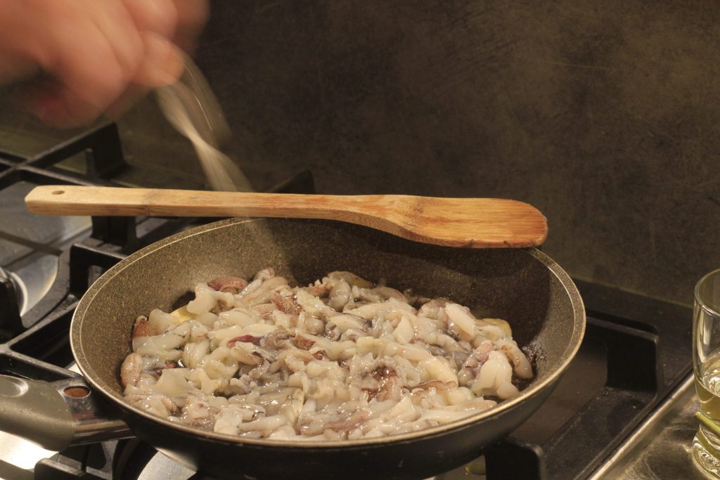 • Doe de knoflook, de olie en de in stukjes gesneden tentakels van de inktvis in de pan. Laat bakken.