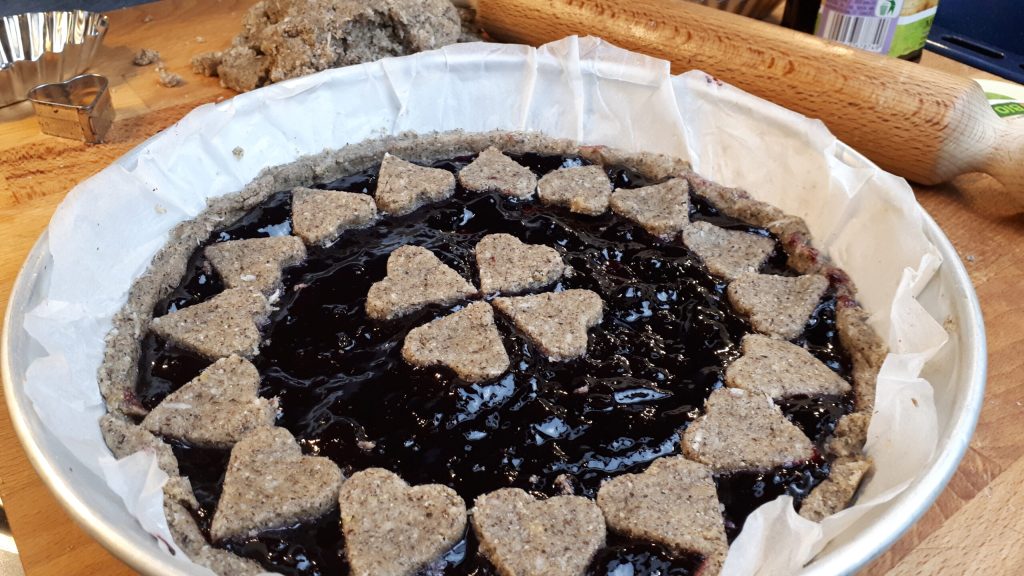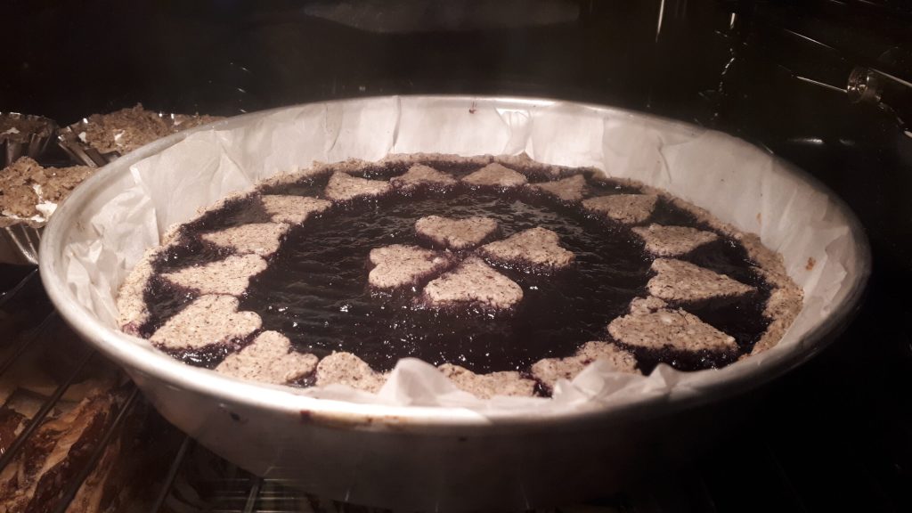 Verdeel de jam over de taartbodem. Zet in de oven voor 35 minuten op 180°