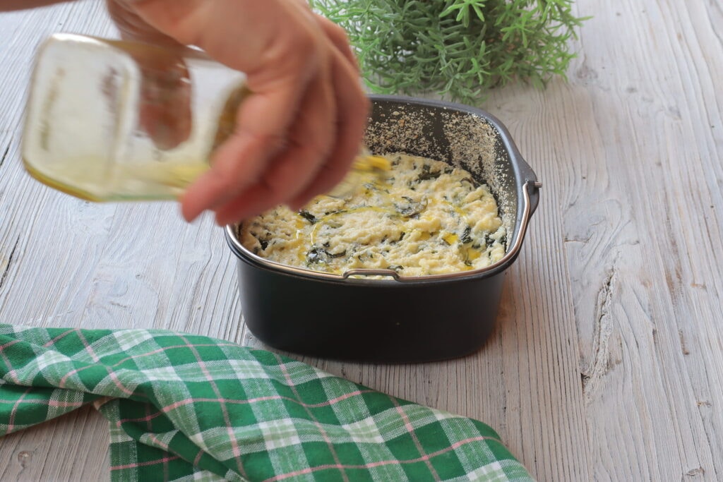 Verdeel het gekruide griesmeel gelijkmatig in de bakvorm, vet het oppervlak licht in en bestrooi met paneermeel.
