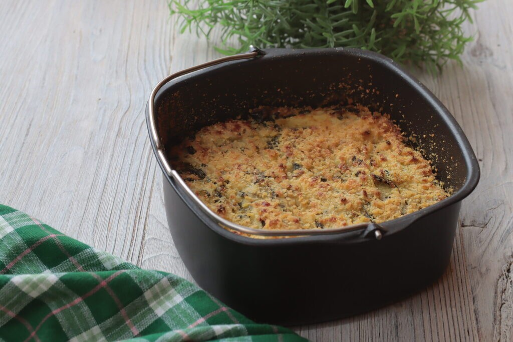 (Als alternatief voor de airfryer, kunt u het grieskoekje met groenten in een traditionele oven op 180°C gedurende 20 minuten bakken)
