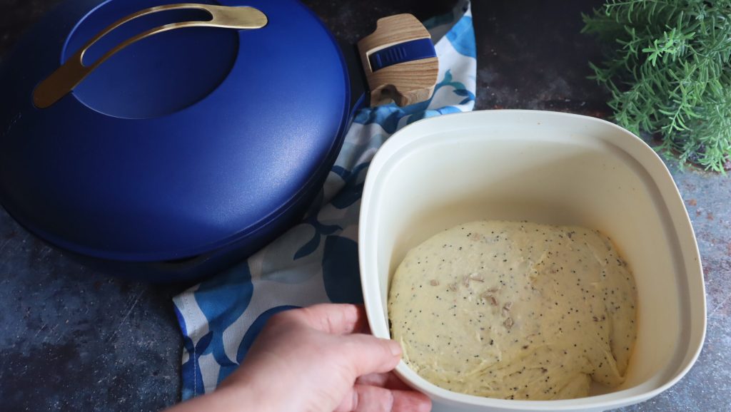 Ik verwarm de oven voor op 225° en zet mijn Cookut-pan op om op te warmen (uiteraard zonder handvat, erg handig omdat het verwijderbaar is). Ik haal de pan uit de oven en leg het gerezen brood erin. Met het speciale broodschaafje maak ik verschillende decoratieve sneden, dek af met het deksel en zet, met behulp van het handvat, 30 minuten in de oven.