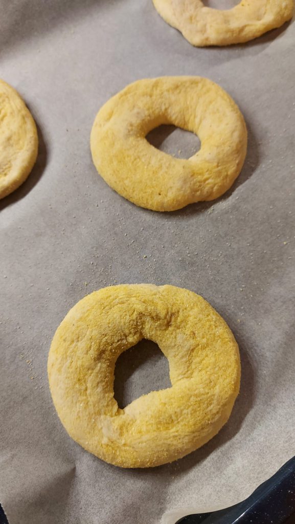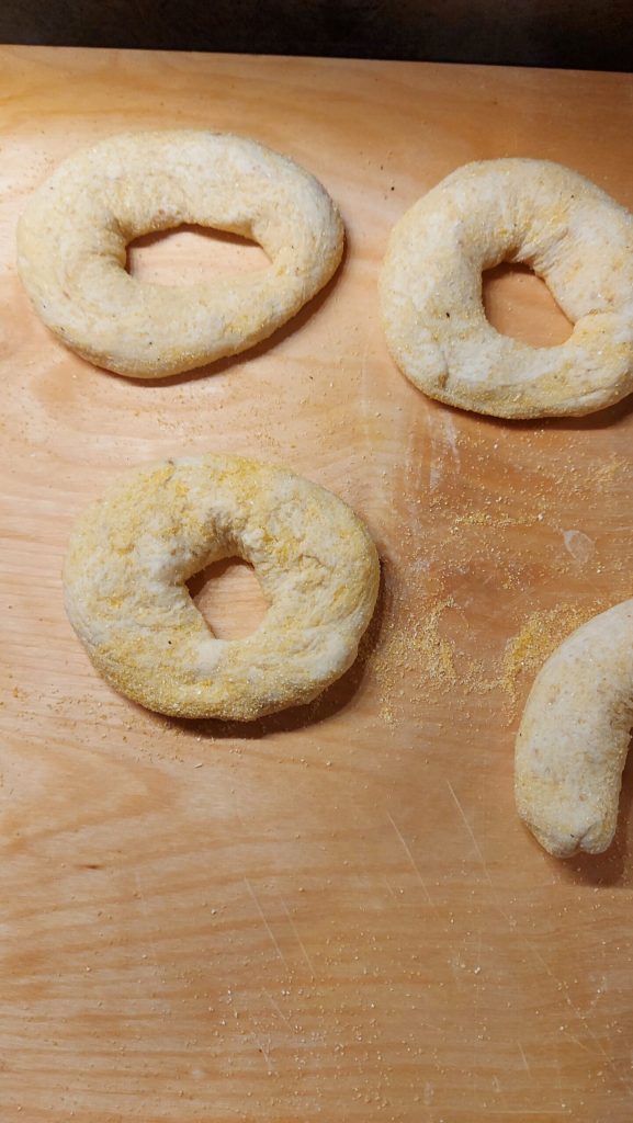 Ik heb het gerezen deeg verdeeld in porties van 100 gram. Ik heb een cilinder gevormd en deze meteen opgerold en gesloten tot een ring.