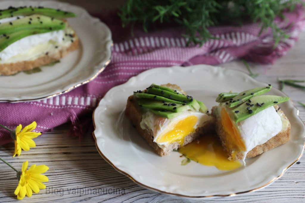 Bereid de gepocheerde eieren, ook wel in de dop genoemd, zo voor: zet een pan met twee liter water op het vuur, met 2 eetlepels azijn en een beetje zout. Zodra het water kookt, laat je het gepelde ei erin vallen en zet je het vuur lager, laat het 3 minuten koken. Haal het ei met een schuimspaan uit het water en leg het een paar seconden op een bord om het te laten afkoelen. Leg het op de snee brood met de nep-mayonaise.