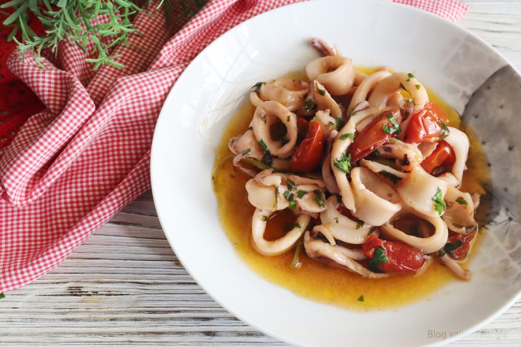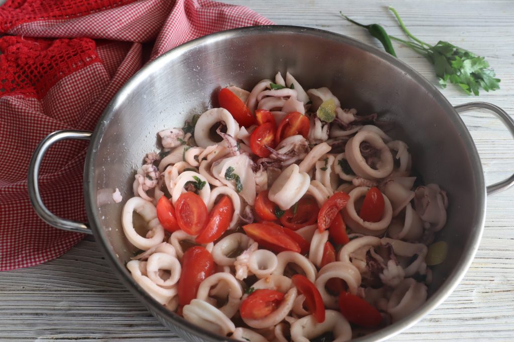 • Ik breng de inktvis op smaak met zout en voeg de gesneden tomaatjes toe. Ik roer en voeg ook een glas water toe, zet de deksel erop en laat nog 10 minuten koken.