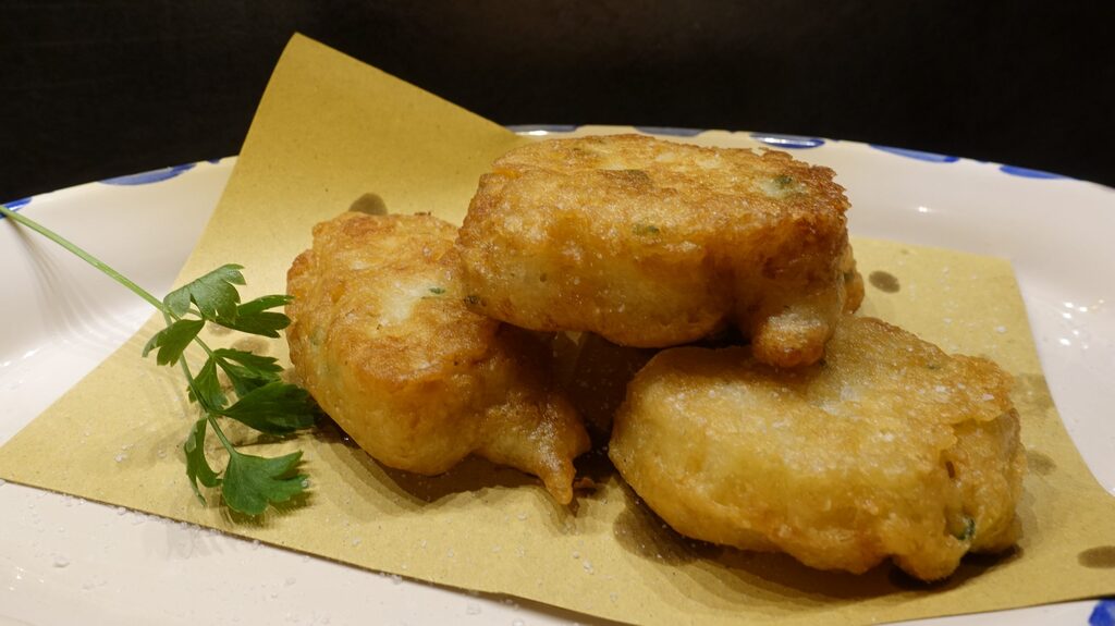Verwarm ondertussen de extra vergine olijfolie en frituur eetlepels kabeljauwbiscuitbeslag. Een extra idee kan zijn om biergist in plaats van droge gist te gebruiken, maar dan moet het kabeljauwbiscuitbeslag dertig minuten rusten; het gefrituurde zal zeker luchtiger zijn.
