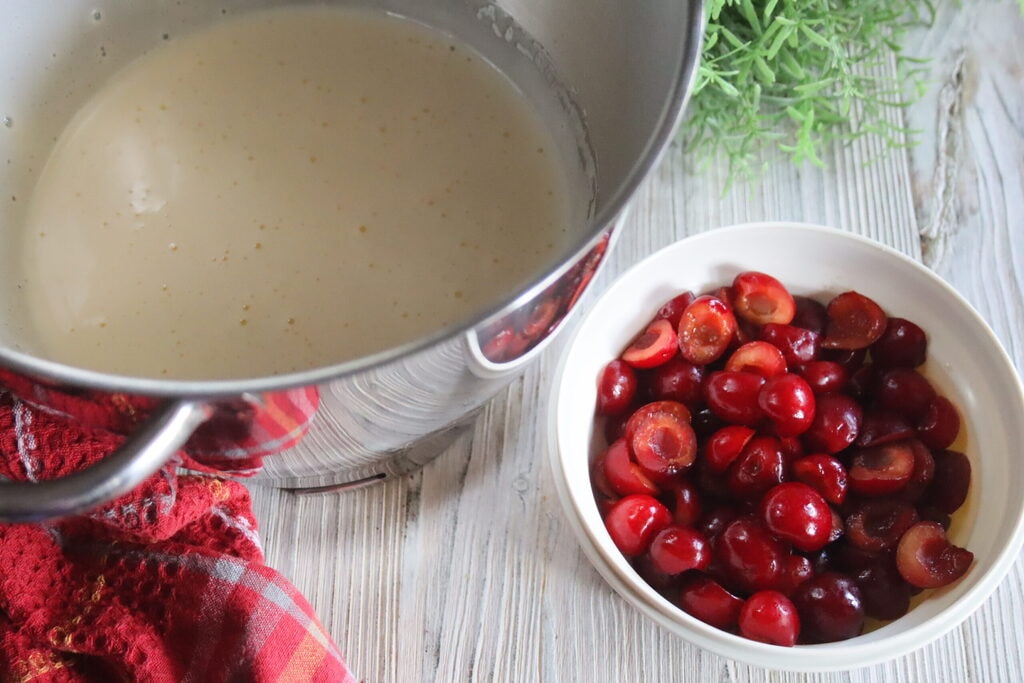 Ondertussen halveer de kersen en verwijder de pit.
