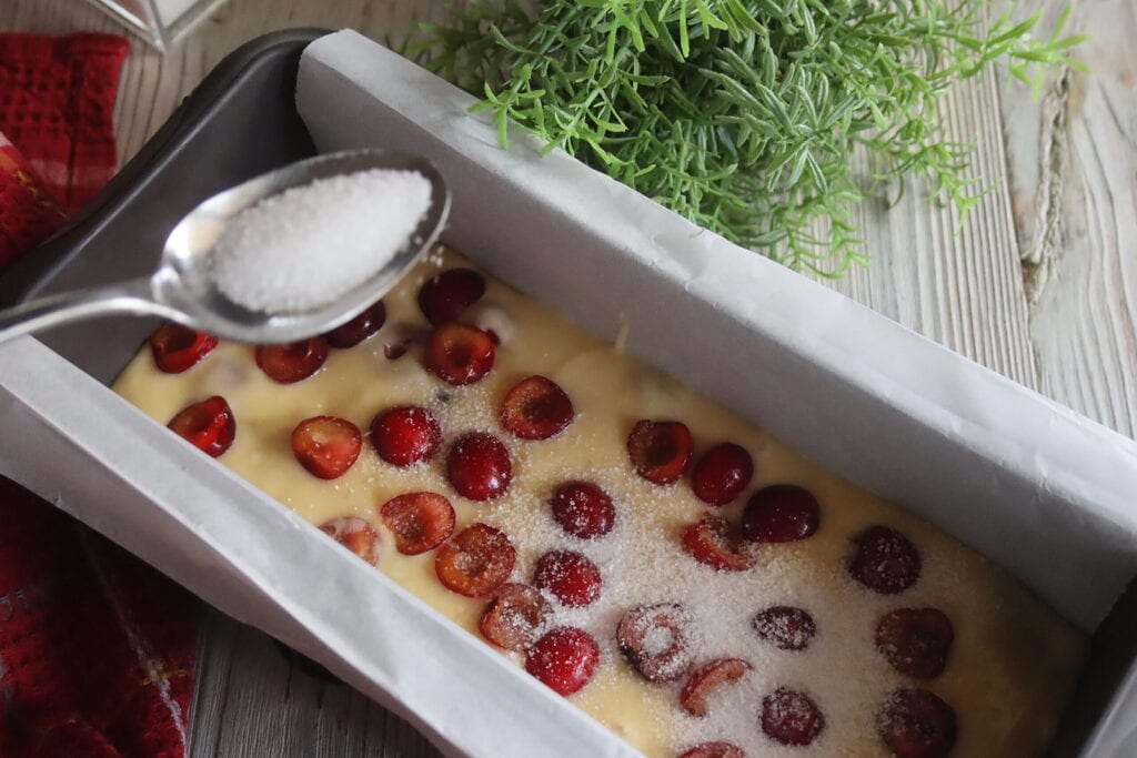 Giet het mengsel in de cakevorm en bedek het met kristalsuiker met een lepel.
