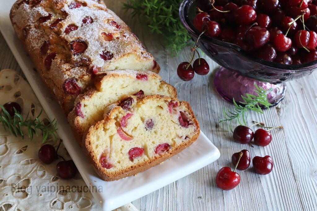 Kersencake, aangezien dit het juiste moment is, laten we ze dan gebruiken en niet alleen rauw als fruit, maar laten we ze ook in de keuken gebruiken om een cake zoals de plumcake te bereiden. De kersen beginnen tegelijkertijd met Moederdag, laten we hiervan profiteren en een ideale cake bereiden voor het ontbijt en ik verzeker je ook voor de middag samen met de koffie. Kleurrijk en sappig, hier komt het zomerse fruit dat ideaal is voor elk moment en niet alleen als nagerecht. Je kunt de kersen gewoon zo eten, maar ze zijn ook verfrissend als je een frisse en verkwikkende smoothie maakt. Van nature zijn kersen het zomerfruit zoals de zachte variëteiten, de meest voorkomende, die heel zoet en zacht zijn, vandaar de naam tenerine. Terwijl de harde kersen of duracine knapperig zijn en zeer stevig en donker vruchtvlees hebben. In dezelfde familie zijn er dan de wilde variëteiten zoals de iets kleinere en meer bittere morellen, die niet verward mogen worden met de visciole die ronder, meer zuur en donkerrood zijn, maar nog steeds tot dezelfde familie behoren en een zeer zoete jam opleveren. Heb je ooit geprobeerd om de ricotta en visciole taart te maken? Ik nodig je uit om het te doen met mijn recept hier.
