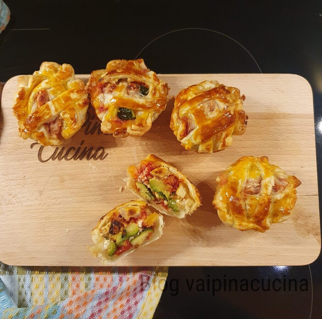 In een steelpan bereid ik de tomaat met extra vergine olijfolie, zout, knoflook en basilicum en laat ik het 15 minuten koken. Ondertussen was en snijd ik de courgettes in blokjes, breng ze op smaak met zout en extra vergine olijfolie en kook ze in de magnetron op de Crispi-stand in een bakplaat met bakpapier gedurende 8 minuten. Ik rasp de kaas en bereid de feta in stukjes. Ik rol het rechthoekige bladerdeeg uit en snijd het in 6 delen, waarbij ik wat stukjes overlaat om de strepen van de kleine taarten te maken. Na het snijden, plaats je ze met bakpapier in de muffinvorm en begin je de ingrediënten samen te stellen. De eerste laag doe je een lepel tomaat, gevolgd door een lepel courgette voor kleine taarten, feta, Parmezaanse kaas en opnieuw de courgettes. Sluit nu af met een laag tomaat met geraspte Parmezaanse kaas en begin 4 stroken bladerdeeg kruisgewijs op de kleine taarten te leggen. Bestrijk de hele oppervlakte van de kleine taarten met het eigeel, zet ze in een voorverwarmde oven op 170°C gedurende 25 minuten.