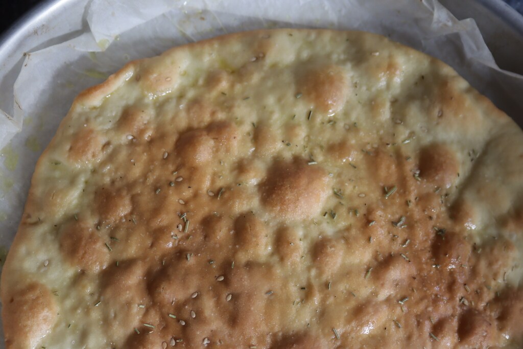 • Ik rol het brooddeeg met de deegroller heel dun uit op het werkblad en probeer het niet te breken. Ik breng op smaak met zout en olie en een paar verkruimelde takjes rozemarijn. Mijn deeg bevat ook sesamzaadjes, maar dat is niet nodig. Zoals ik hierboven al heb uitgelegd, is dit oorspronkelijk geen pizza, maar als ik brood maak (daarom de sesamzaadjes), haal ik altijd een beetje deeg eruit en rol ik het uit om een superdunne pizza te maken.