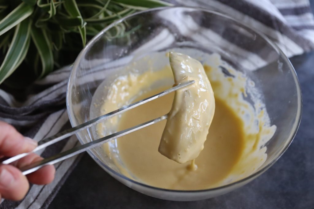 Ik leg de met beslag bedekte snijbietsteel in het gekruide paneermeel.