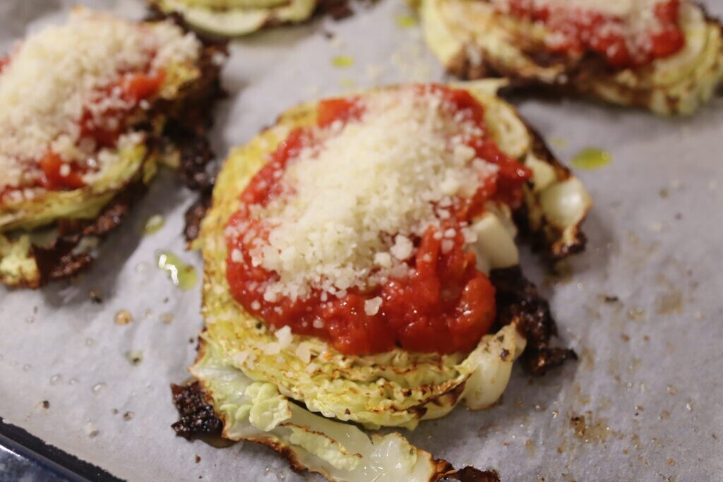 Verwijder de eerste drie bladeren van de kool, die we later zullen gebruiken om in de minestrone te doen. Snijd de kool in dikke plakken, leg ze op de bakplaat met bakpapier, breng op smaak met zout en peper, chilipoeder en oregano, en voeg tot slot extra vergine olijfolie toe en bak gedurende 30 minuten op 190°C. Ondertussen kook je in een pannetje de tomatensaus met knoflook en zout, peper en oregano, een royale scheut olijfolie en laat 10 minuten sudderen.