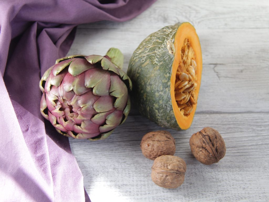 Breng de pompoen op smaak met zout en olie en plaats deze 15 minuten in de oven op 190°. Doe hetzelfde met de artisjokken en hun stelen.