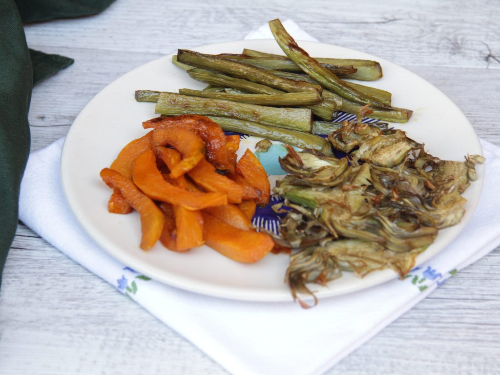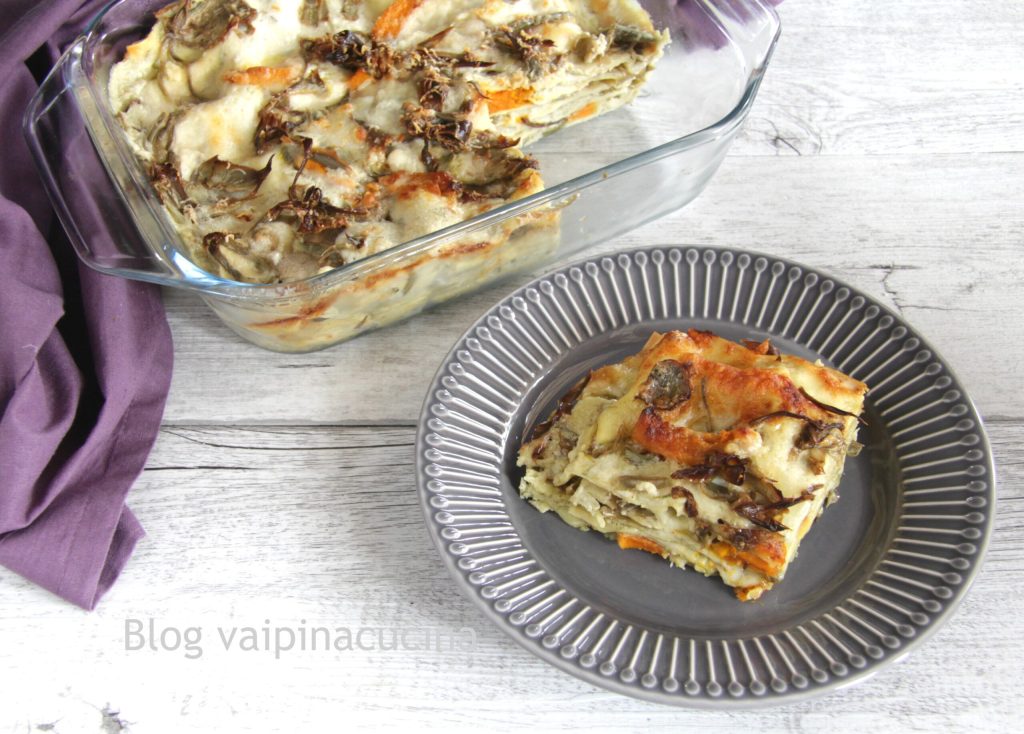 Lasagne met artisjokken en pompoen, een goed alternatief voor de meer klassieke lasagne met vleesragù, vooral als je vegetariër bent. Dit is het verhaal van een snelle lasagne en afgezien van de bechamelsaus, zou ik zeggen ook licht. Mijn lasagne heeft geen voorgekookt droge deeglaagje, dankzij de oven, mijn oven, die me in staat stelt om gelijktijdig met stoom en ventilator te bakken, een mooie combinatie om de lasagne in zeer korte tijd te bereiden. Mijn groenten, de artisjokken en de pompoen, bak ik in de oven met heel weinig olie zodat ze mooi knapperig blijven, de stelen van de artisjokken, ook in de oven gekookt, maal ik en voeg ik toe aan de bechamelsaus. Ik garandeer u dat een bechamelsaus met artisjokken op deze manier uw gerecht zeker zal verrijken.