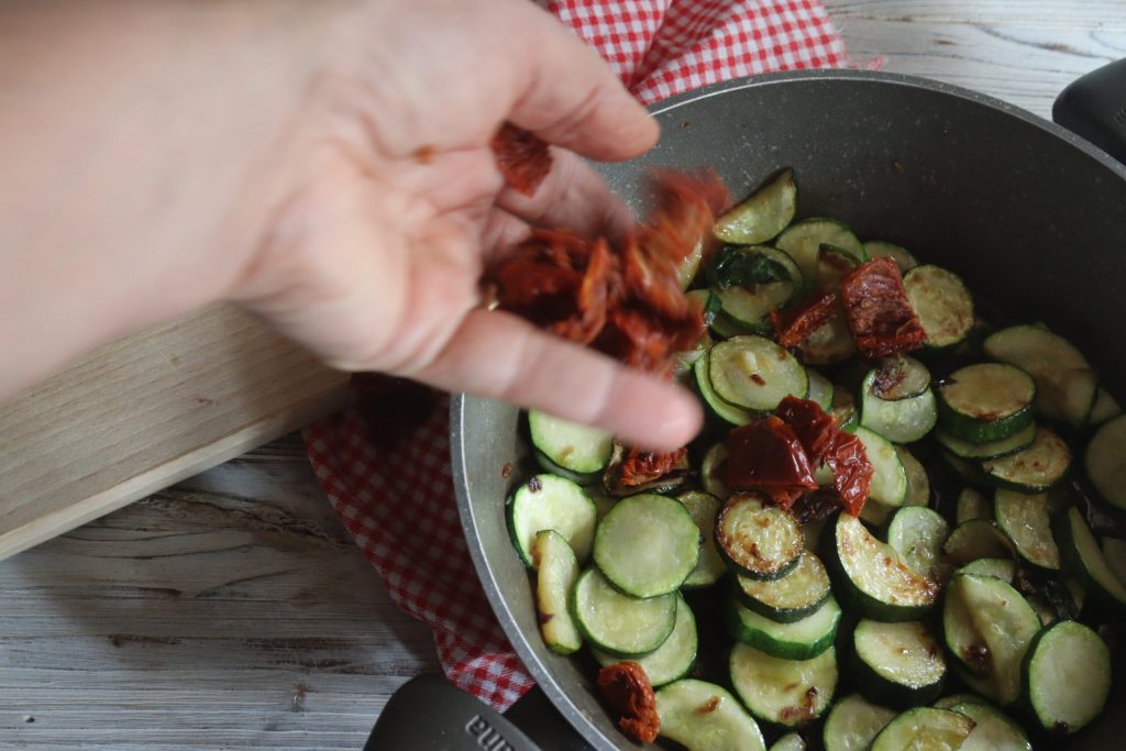 Ik snijd de gedroogde tomaten in meerdere stukken nadat ik ze een minuut heb geblancheerd en voeg ze toe aan de courgettes in de pan.