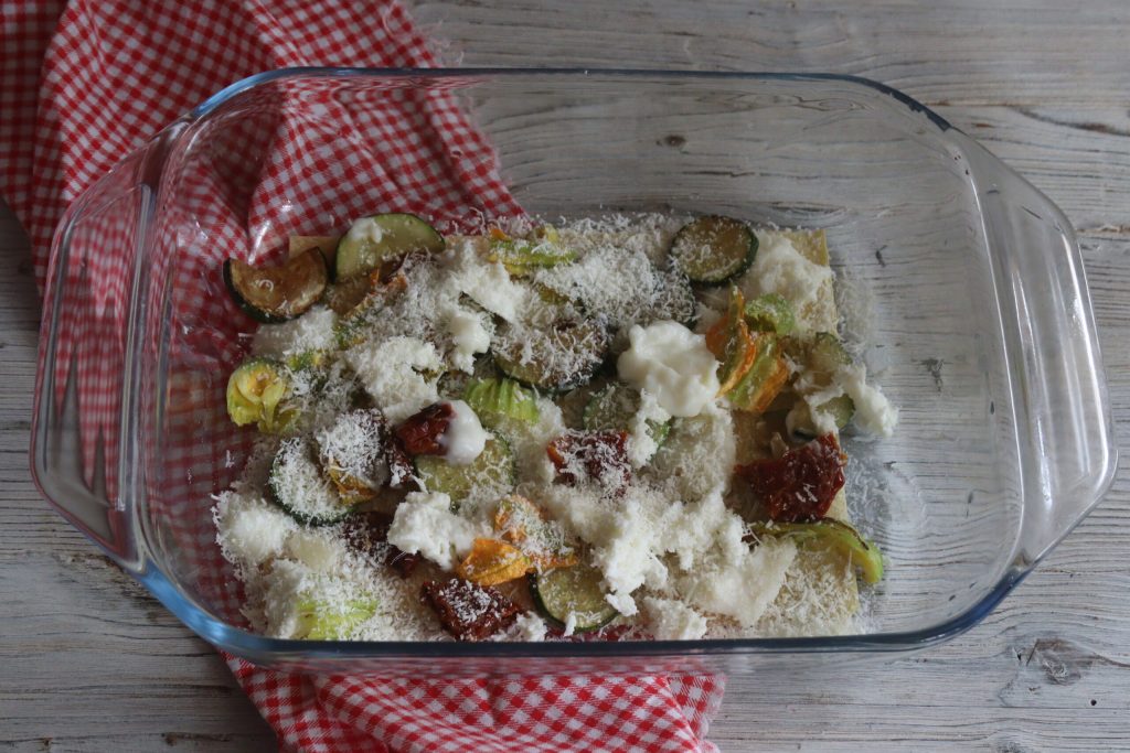 Lasagne met courgettebloemen en gedroogde tomaten, het laatste staartje van de zomer heet “lasagne met courgettebloemen en gedroogde tomaten”. We verwelkomen de herfst met dit geweldige eerste gerecht. De laatste courgettes evenals de laatste courgettebloemen, terwijl we de gedroogde tomaten het hele jaar door vinden omdat we ze in augustus hebben voorbereid. Met deze lekkernij beloof ik dat je de Bolognese lasagne niet zult missen, ook al staat het op de vierde plaats van de favoriete Italiaanse eerste gerechten van buitenlanders, namelijk lasagne. Een gerecht dat door iedereen geliefd is en niet noodzakelijk met vleesragout. Hieronder vind je enkele van mijn eenvoudige recepten om lasagnes op verschillende manieren te bereiden met veel seizoensgebonden en voornamelijk plantaardige ingrediënten.