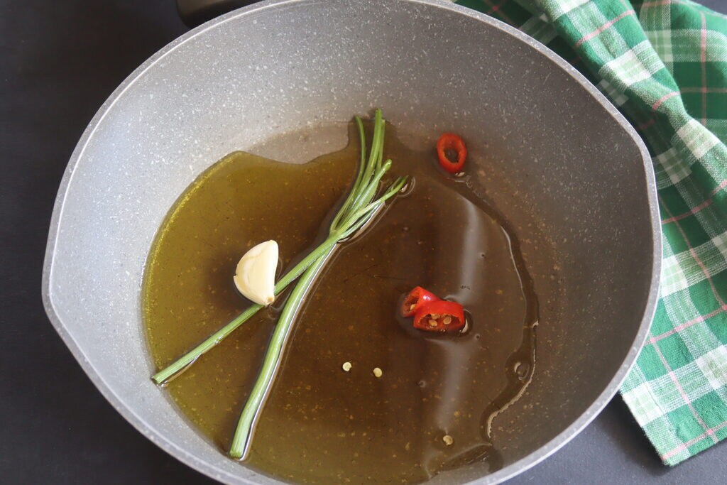 Onmisbaar is de fruit van knoflook met chilipeper en peterseliestelen in extra vierge olijfolie.